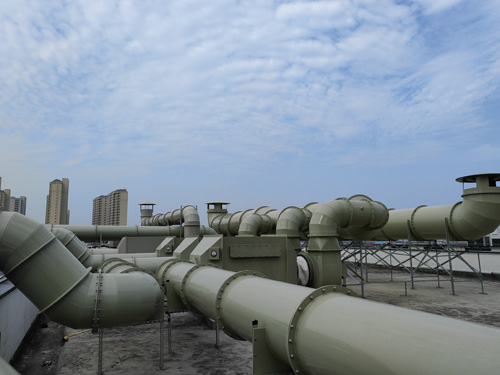實驗室尾氣排放物 → 滲透性炭篩選器 → 引軸流風機 → 尾氣排放